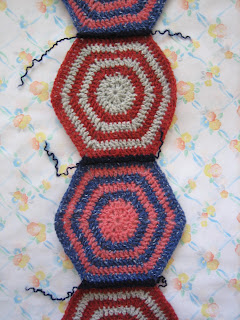 Jag virkar ihop lapparna på tvären till remsor först, och sedan remsorna i zickzack på längden. Jag fäster trådarna vartefter jag virkar, så det blir omväxling. Fästa, virka, fästa, virka, fästa. Det mörkblå trådarna blir fästade när jag virkat ihop på längden. Jag virkar ihop med fastmaskor, och jag tycker om den markerade kanten. Det skulle se ännu bättre ut med ett varv fastmaskor runt kanten först, men det blir för mycket besvär att ta en bunt lappar med på bussen till den här. Jag virkar på bussen. Hemma stickar jag.
